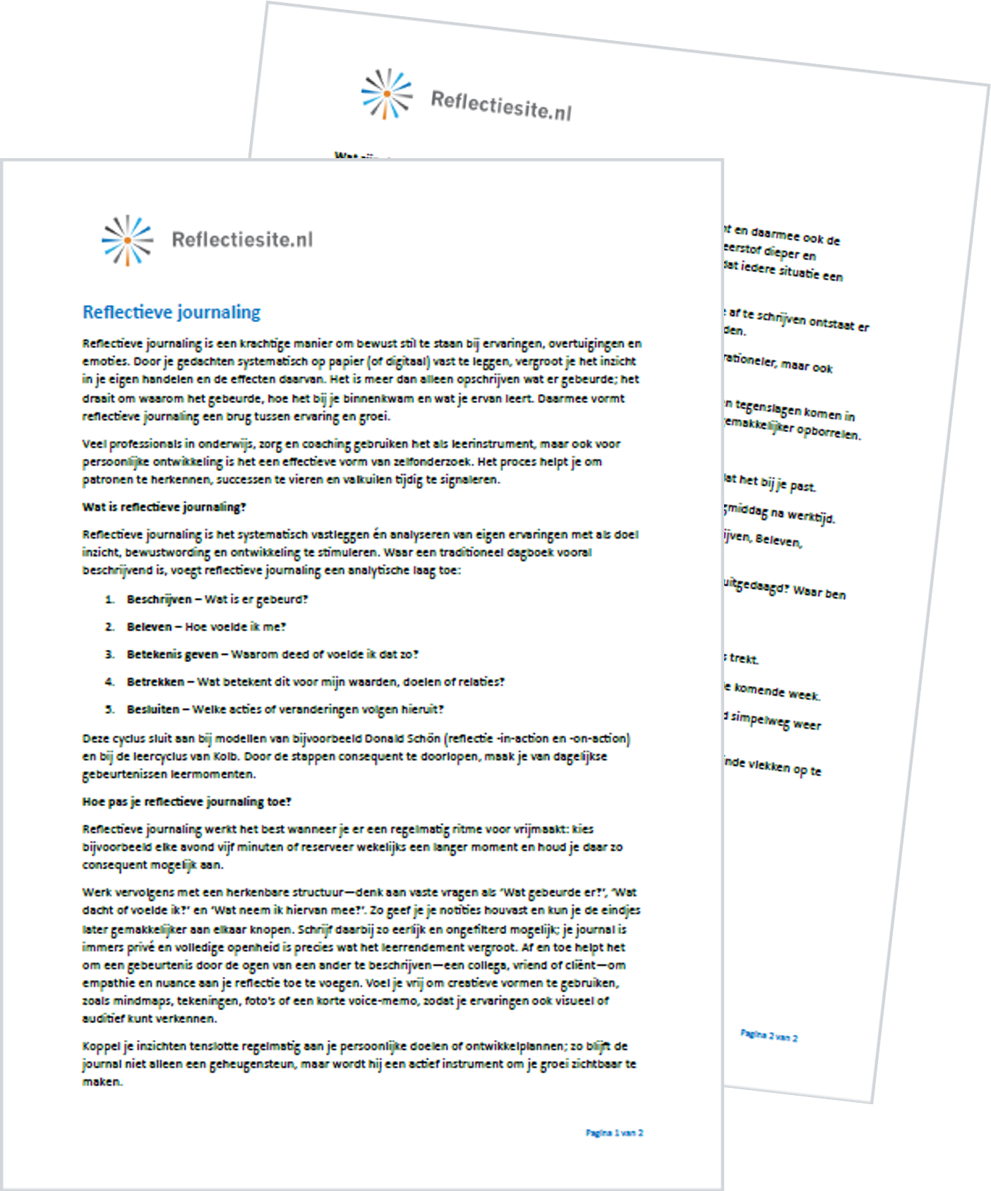 Reflectieve journaling is een krachtige manier om bewust stil te staan bij ervaringen, overtuigingen en emoties. Door je gedachten systematisch op papier (of digitaal) vast te leggen, vergroot je het inzicht in je eigen handelen en de effecten daarvan. Het is meer dan alleen opschrijven wat er gebeurde; het draait om waarom het gebeurde, hoe het bij je binnenkwam en wat je ervan leert. … Continue reading Reflectieve journaling