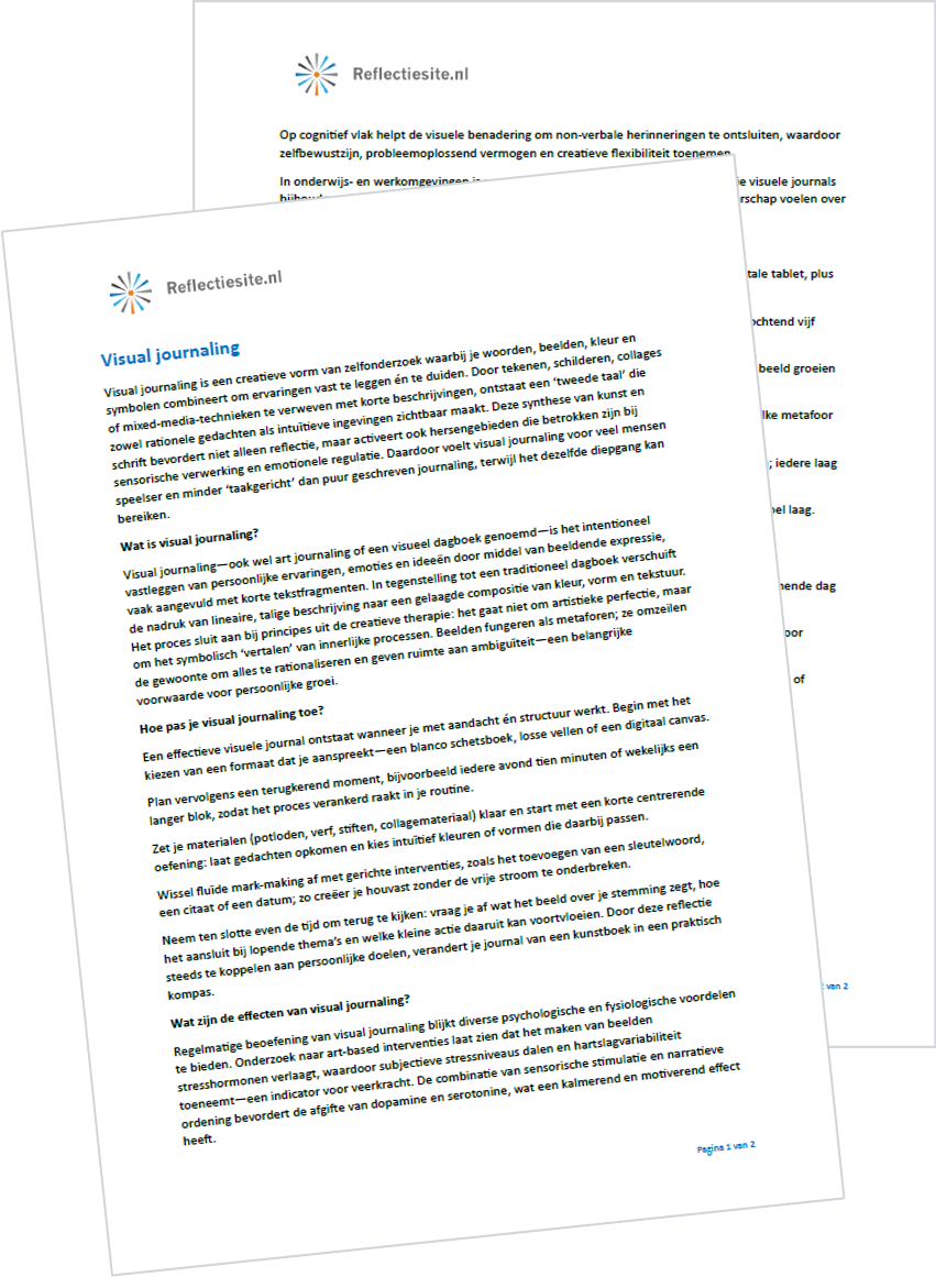 Visual journaling is een creatieve vorm van zelfonderzoek waarbij je woorden, beelden, kleur en symbolen combineert om ervaringen vast te leggen én te duiden. Door tekenen, schilderen, collages of mixed‑media‑technieken te verweven met korte beschrijvingen, ontstaat een ‘tweede taal’ die zowel rationele gedachten als intuïtieve ingevingen zichtbaar maakt. Deze synthese van kunst en schrift bevordert niet alleen reflectie, maar activeert … Continue reading Visual journaling